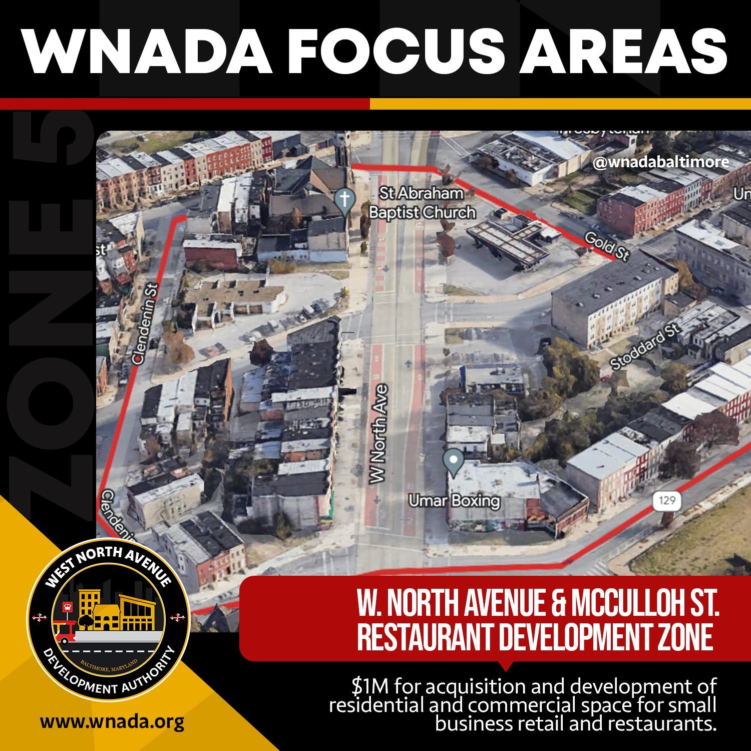 The West North Avenue Development Authority (WNADA), a State of Maryland economic development agency for Baltimore City. The agency was established to create a comprehensive plan for housing, economic, transportation, and neighborhood development along West North Avenue between 600 - 3200 Block, defined as the Target Area, and 250 yards surrounding the Target Area, defined as the Buffer Zone.